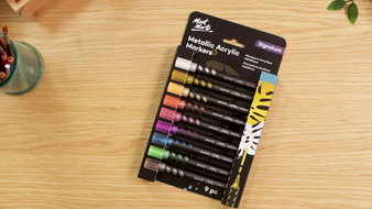 Add some sparkle to your artworks with this acrylic marker set. Includes 9 shimmery metallic shades.