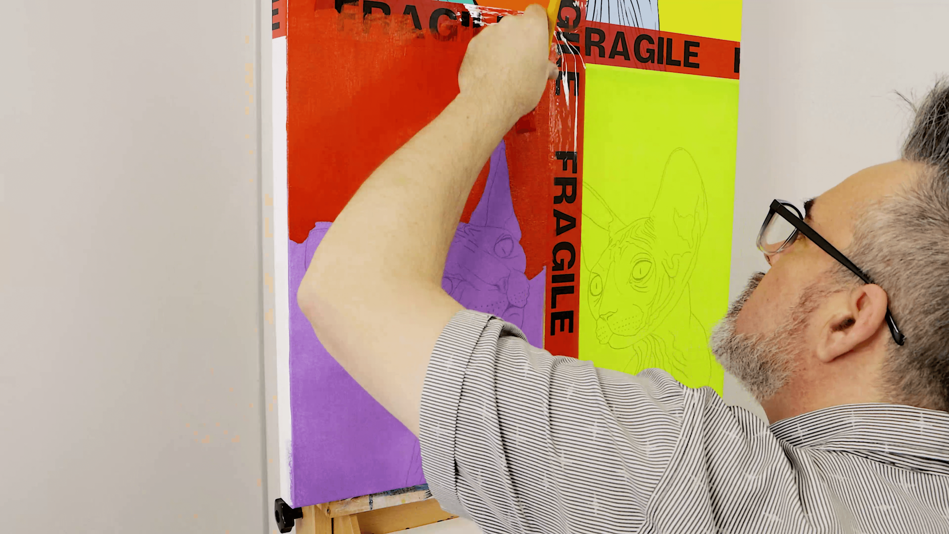 Combine Titanium White and a touch of Violet to make a light purple colour. Paint the third cat with the damp roller.