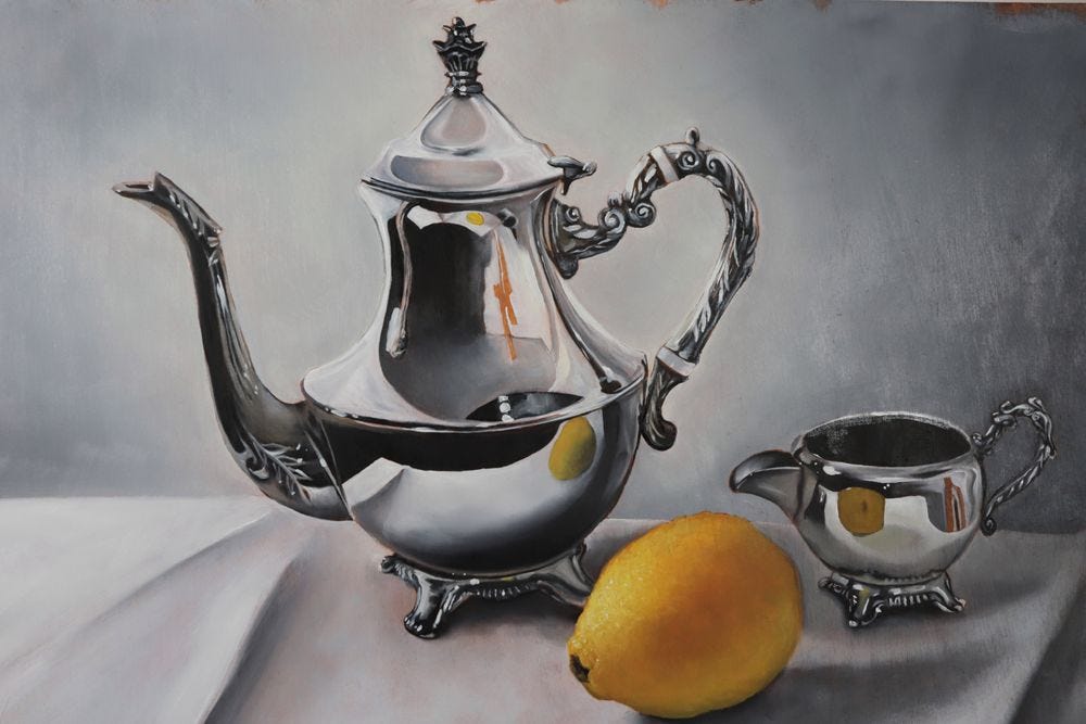 Still life painting with reflective surfaces