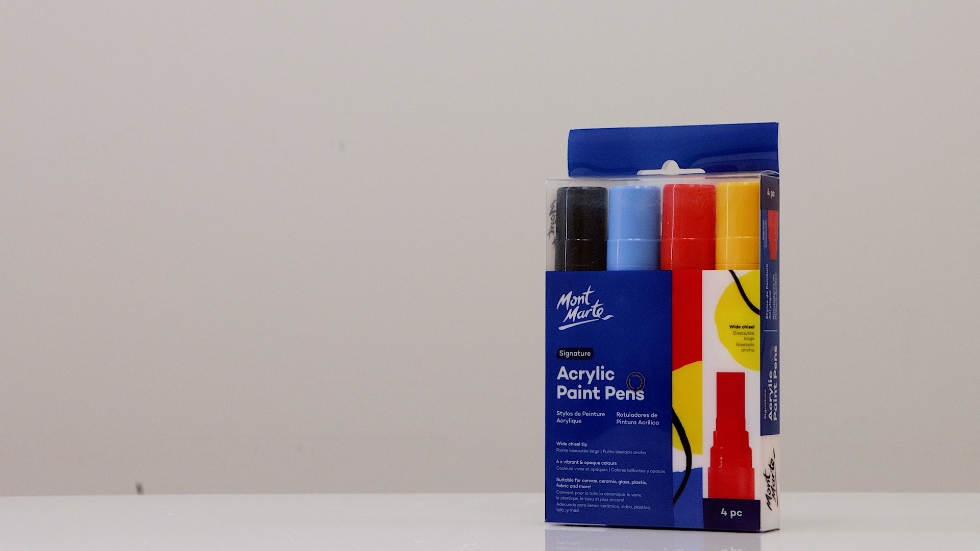 - Paint pen set includes 4 essential colours: Cadmium Yellow, Scarlet, Royal Blue, Black